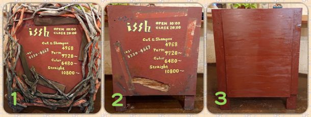 1・最初の状態 / 2・流木などを取り払いました。 / 3・穴を埋めて新しい板を張り付けました。
