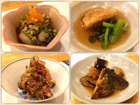 牡蠣ポン酢・里芋のケシ揚げと小松菜・アジのなめろう・子持ち鮎の煮込み