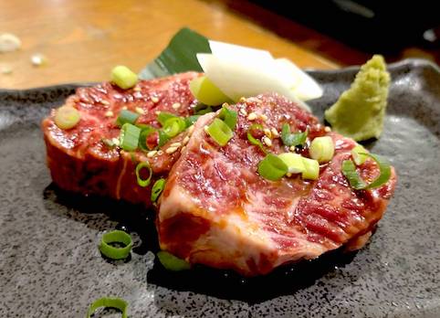 分厚いハラミ肉の表面に火を入れ、ハサミでカットすると…美しい断面が♬