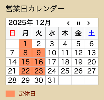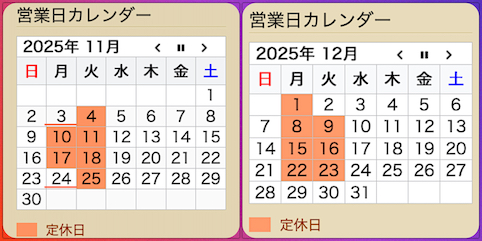 上記のように11月と同じく、12月も火曜日のお休みが多くなります。