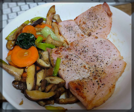 ハムステーキと、キノコとニンジンと小松菜ソテー。