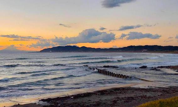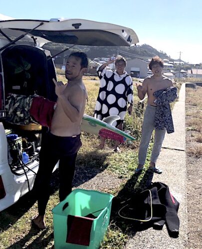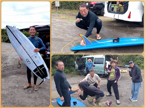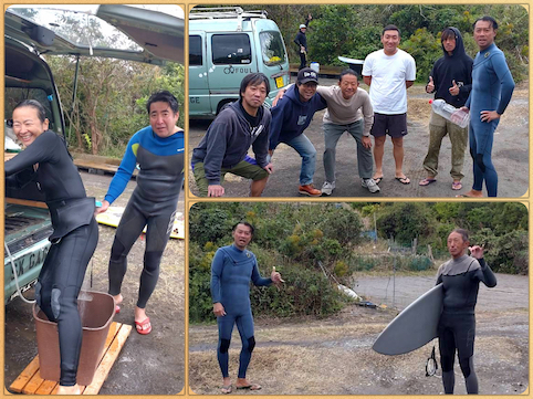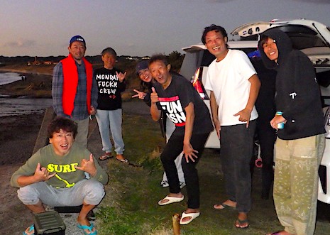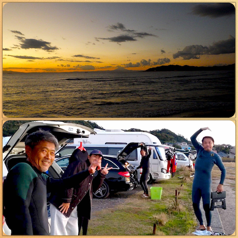 美しい夕焼けと、良い波で遊べて皆ニコニコ笑顔写真。