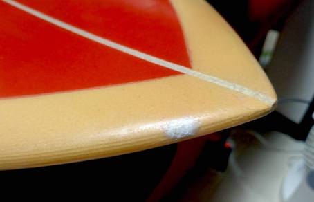 フィンをやらないように慌ててボードから降りて、板を流したらリーフにヒットw