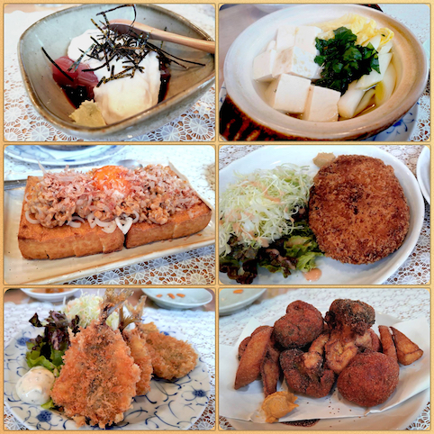 山かけ・湯豆腐・厚揚げ焼き・ジャンボコロッケ・アジフライ・揚げブロッコリー