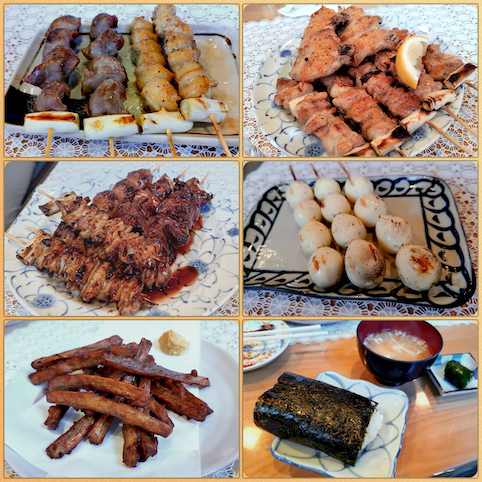 砂肝・ボンジリ・手羽先・ネギ間・鶏皮・レバー・うずら・揚げゴボウ・おにぎり