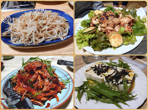 モヤシナムル・チキン・イカと野菜の辛いやつ・オリーブオイルと塩昆布の豆腐。