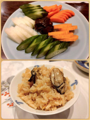 お母さんの手作りお漬物と一緒に食す牡蠣ご飯 ♡