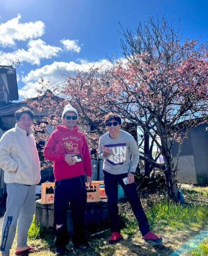 美浜寿しさんの駐車場に咲いている河津桜をバックにパシャリ♬