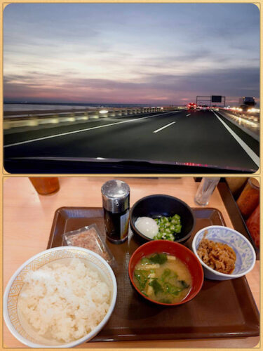 幻想的な夜明け空をアクアラインで眺め、館山のすき家で朝食。