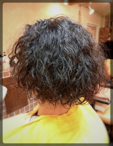 サイドとバックはツーブロックで、トップにウエーブパーマ。