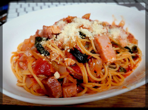 ベーコン・タマネギのアラビアータ。(黒く写っているのはホウレン草ですw)