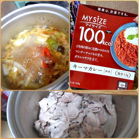 軽く湯通しした豚こま肉を入れて煮込み、レトルトキーマカレーをIN!